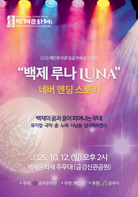 『 2025 예인촌 아흔 일곱 번째 정기공연 '백제 루나 LUNA, 네버 엔딩 스토리' 』글의 상세내용을 확인하는 표로 제목, 작성자, 등록일, 조회, 첨부, 내용으로 나뉘어 설명합니다.