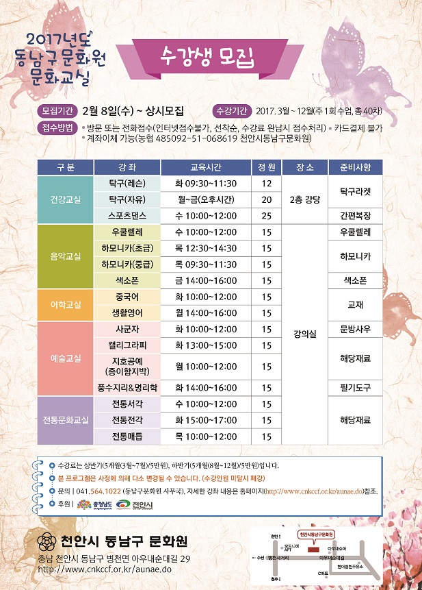 『 2017년 천안시동남구문화원 문화교실 수강안내 』글의 상세내용을 확인하는 표로 제목, 작성자, 등록일, 조회, 첨부, 내용으로 나뉘어 설명합니다.