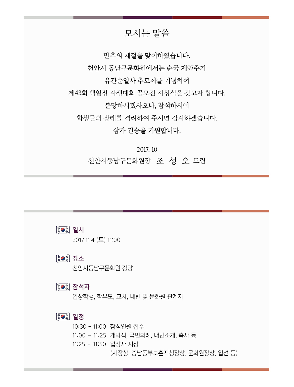 | 제목 | 순국 제97주기 유관순열사 추모제기념, 제43회 백일장 사생대회 공모전 시상식 안내 | ||||