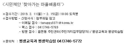 | 제목 | 2019 시민제안 '찾아가는 마을배움터' 사업 신청안내 | ||||
