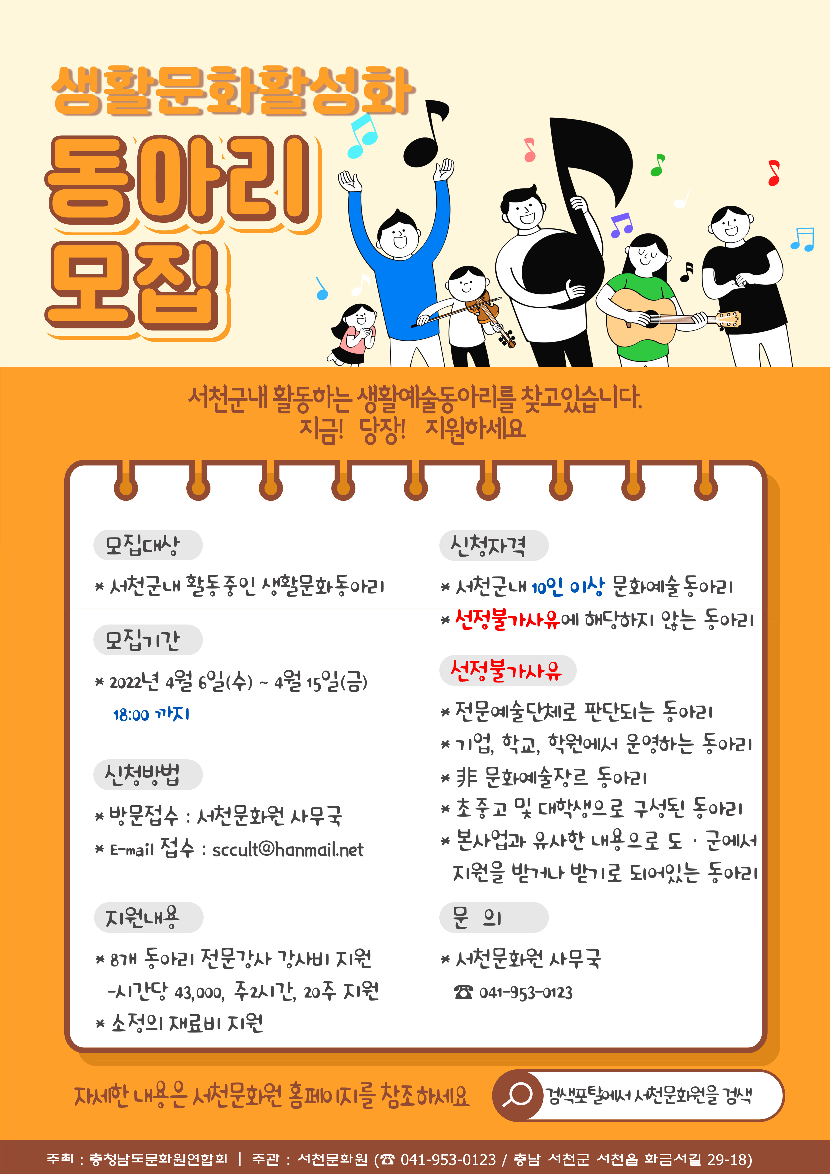 2022 생활문화 활성화 지원사업 동아리 공모 사업목적 생활문화 동아리의 자생발전 및 동아리 역량강화를 통한 동아리 활성화를 위함 2. 지원내용 ○ 지원내용 - 동아리 전문강사 강사비 지원 ※ 시간당 43,000원, 주 2시간, 20주 지원(1,720,000원) - 소정의 재료비 1회 지원 3. 신청자격 ○ 서천군내 10인 이상 문화예술 동아리 ○ 아래 선정불가사유에 해당하지 않는 동아리