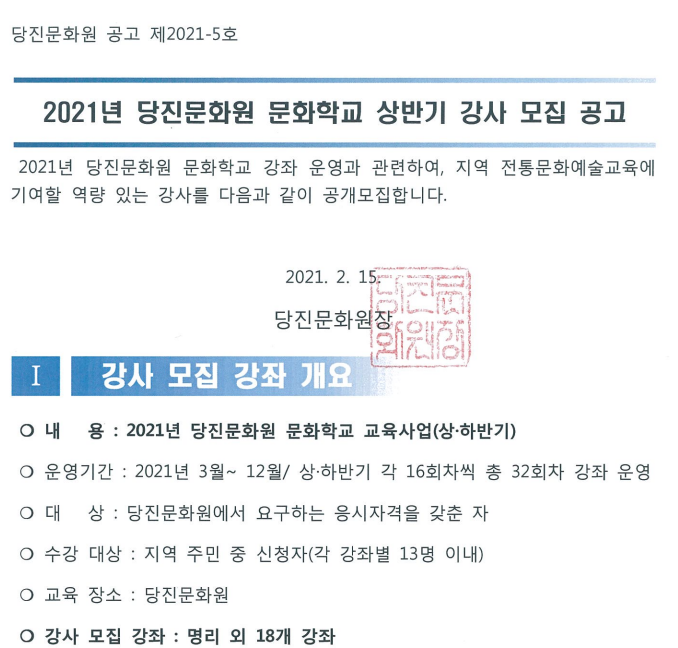 | 제목 | 2021년 상반기 당진문화원 문화학교 강사 모집 공고 | ||||
