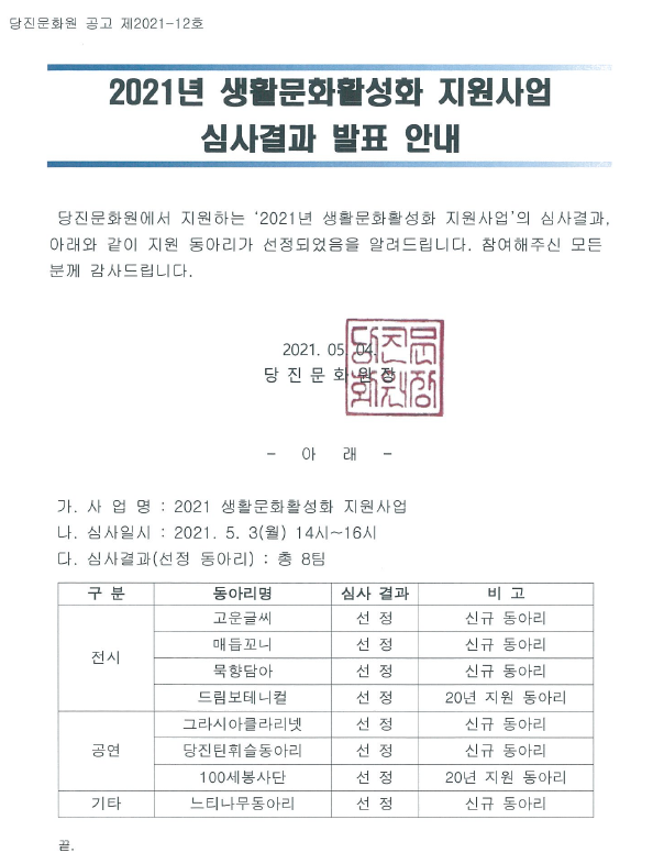 2021년 생활문화활성화 지원사업 심사결과 발표 안내