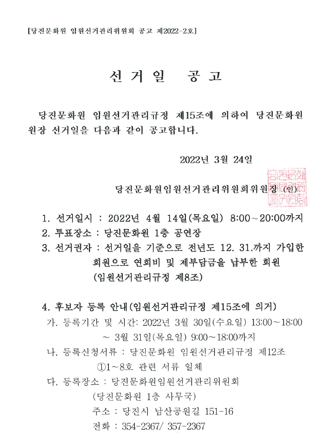 | 제목 | 2022년 제12대 당진문화원장 선거 관련 선거일 공고 | ||||