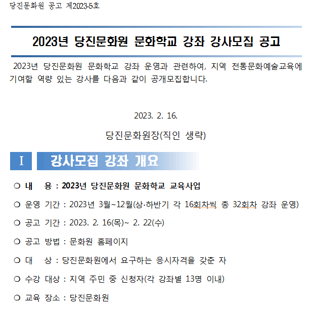 | 제목 | 2023 당진문화원 문화학교 신규 강사모집 공고 | ||||