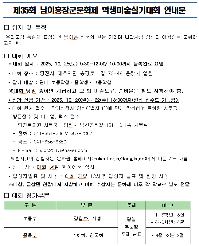 제목 | 제35회 남이흥장군문화제 학생미술실기대회 안내 | ||||