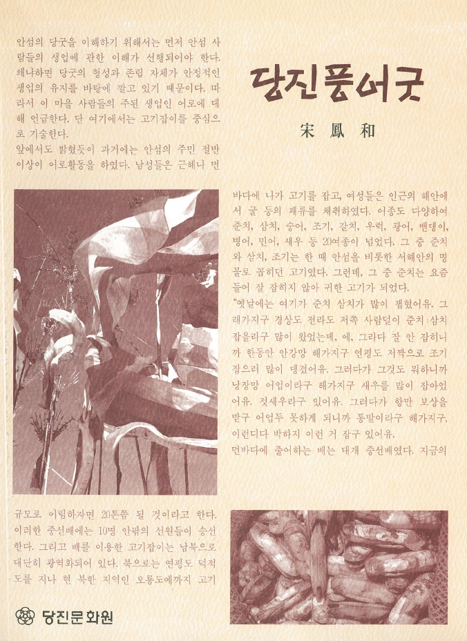 당진 풍어굿은 ''조기잡이''와 관계가 깊다. 70년대 정 부는 부족한 식량을 확보하기 위해 간척사업을 본격적 으로 추진하면서 서해안의 해류가 뒤바뀌게 되었고 그 런이유로 해방 전까지는 풍성하게 잡히던 조기 수확량 이 현저하게 줄어들게 되었다. 저 아래 칠산어장에서 시작해서 연평도까지 올라가던 조기들은 당진해역의 옆구리를 지나게 되어, 당진지역의 성구미 포구, 내도 리포구, 그리고 한진포구의 파시는 성황을 이루곤 했 다. ''보꾸보꾸-'' 또는 사람들이 개구리 울음소리로 기 억하고 있는 조기떼의 울음소리는 수십만마리의 황금 조기떼의 울음이었던 것이다. 그 울음을 만난 어부들 은 그물이 찢어지도록 소기를 잡았으며, 그런 조기 수 확을 염원하는 풍어 굿은 바닷가 마을에서 성행하게 되었다. 우리 고장의 기지시 줄다리기는 농업과 밀접 하게 관련되어있지만, 해안지역엥서는 풍어를 기원하는 의미를 가지고 있었을 것이고 그러한 축제 는 아무리 시대를 달리한다해도 전승시 켜가야할 책임이 있는게 아닐까? -저자의 서문 중에서-