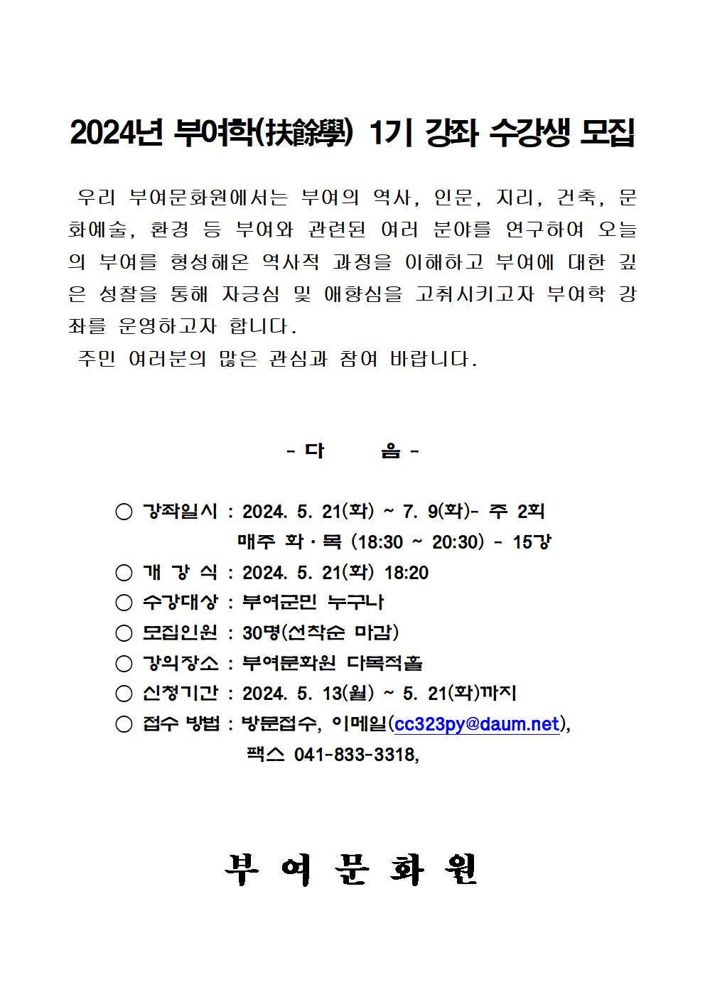 | 제목 | [공지[ 2024년 부여학〔扶餘學〕 강좌 1기 수강생 모집 안내 | ||||
