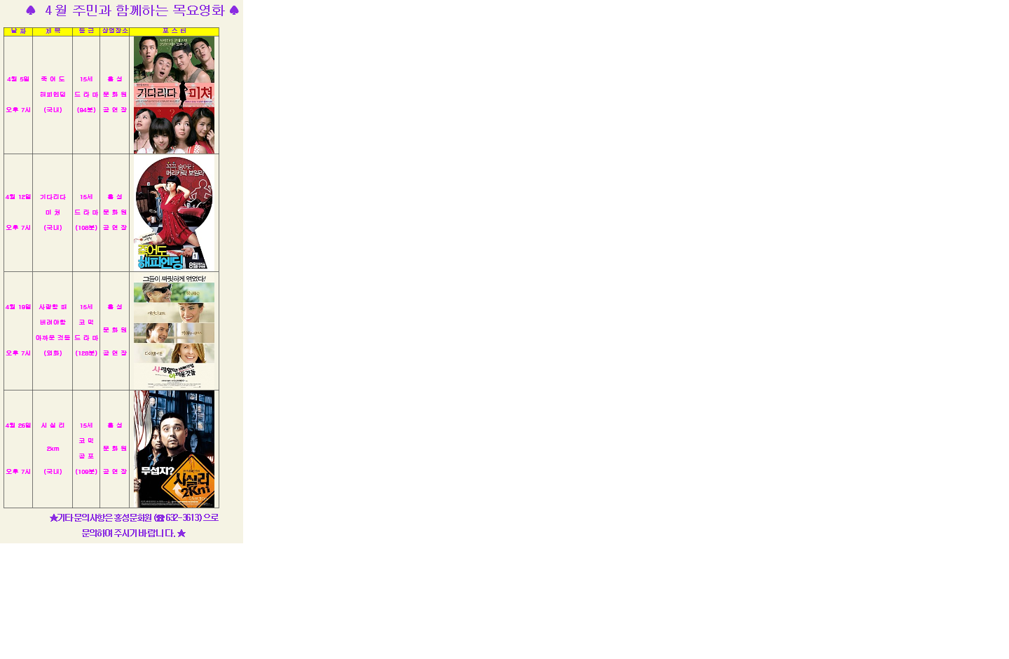 | 제목 | [영화상영] 2012 4월 주민과 함께하는 목요영화 안내 | ||||