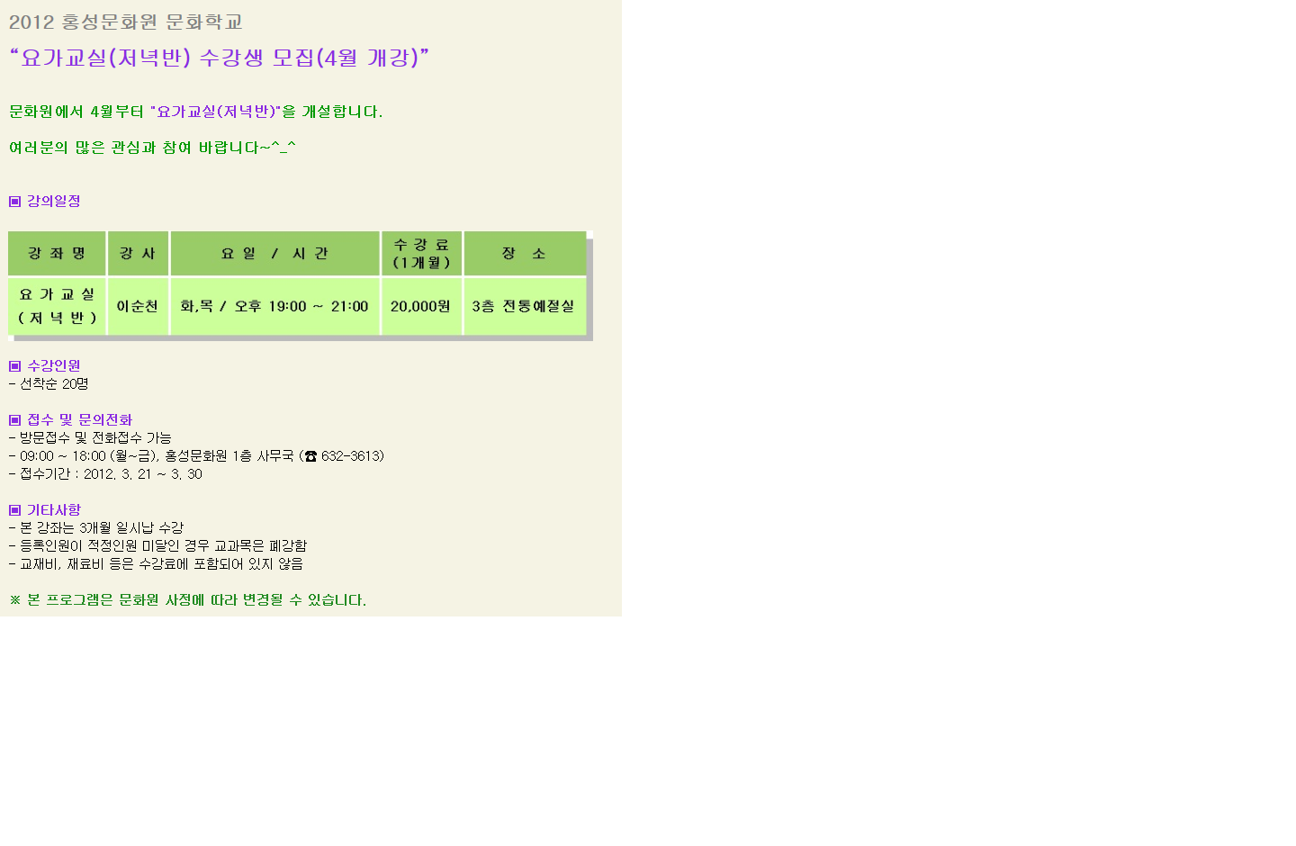 | 제목 | [문화학교] 2012 요가교실(저녁반) 수강생 모집(4월 개강) | ||||