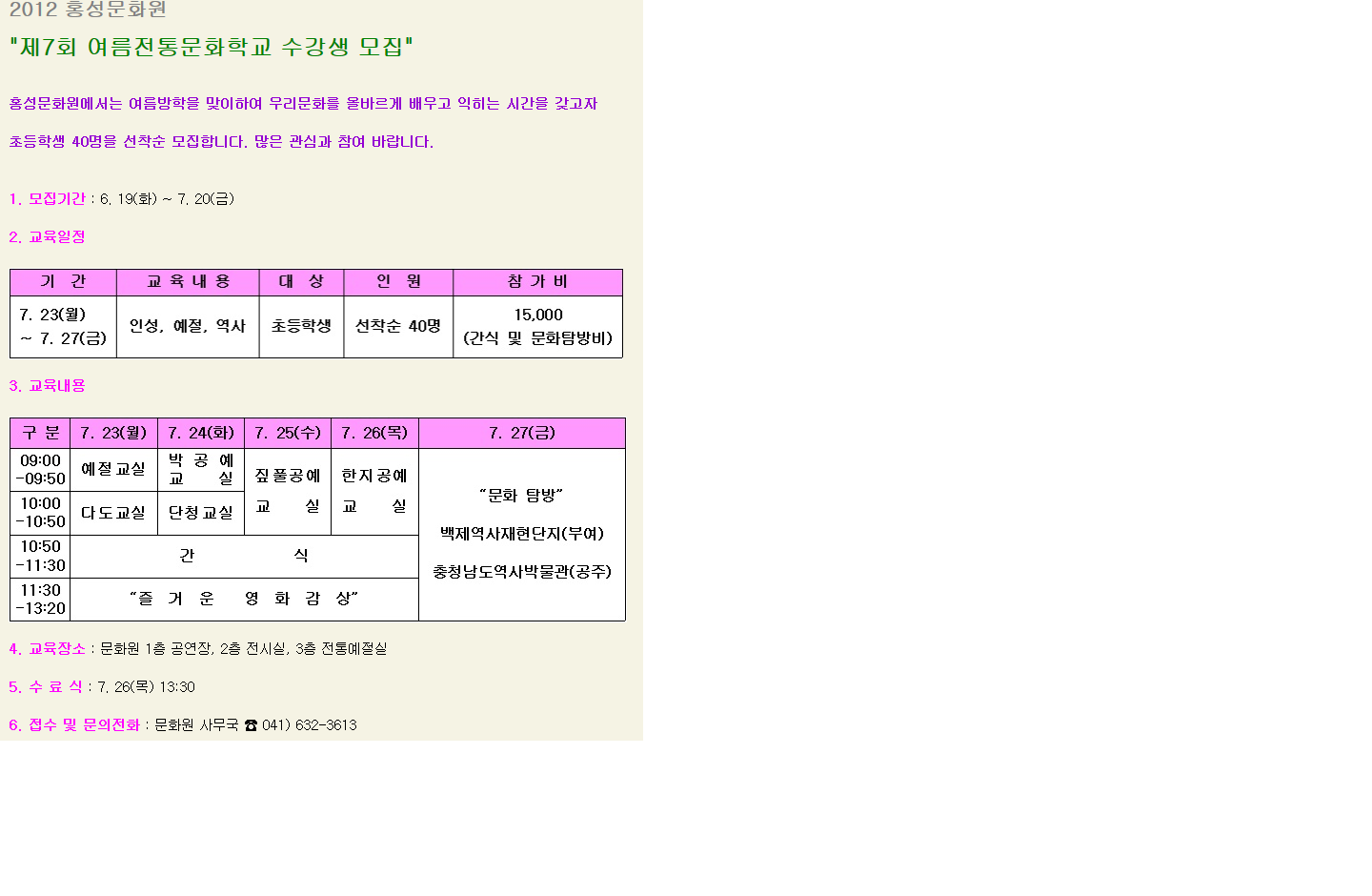 | 제목 | [여름전통문화학교] 2012 제7회 여름전통문화학교 수강생 모집 안내 | ||||