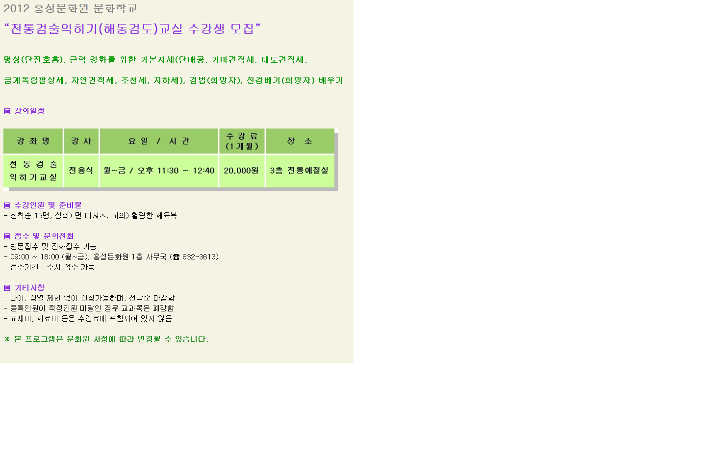 | 제목 | [문화학교] 2012 전통검술익히기(해동검도)교실 수강생 모집 | ||||