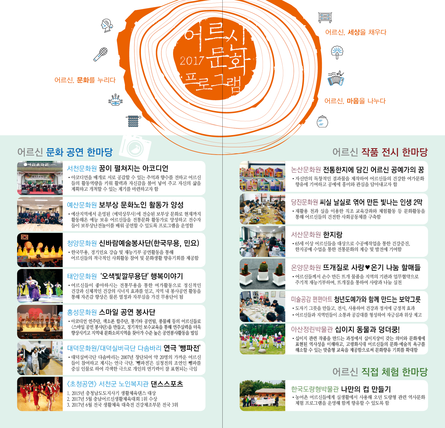 | 제목 | 2017 어르신 문화프로그램 '충남의 어르신, 문화로 소통하다'에 여러분을 초대합니다. | ||||