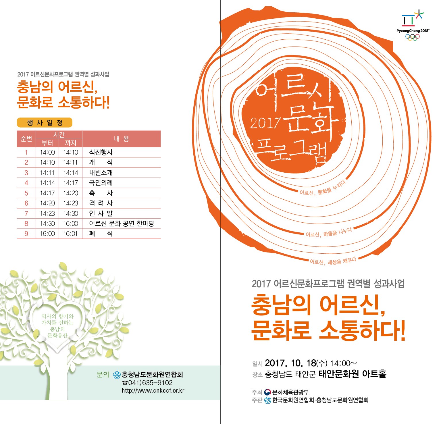 건강한고 행복한 삶을 추구하는 어르신들의 문화축제, '충남의 어르신, 문화로 소통하다' 에 여러분을 초대합니다. 공연, 전시, 체험이 어우러진 어르신 축제의 장에 함께하시어 자리를 빛내주시기 바랍니다.