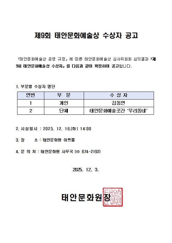 제9회 태안문화예술상 수상자 공고 글의 상세내용