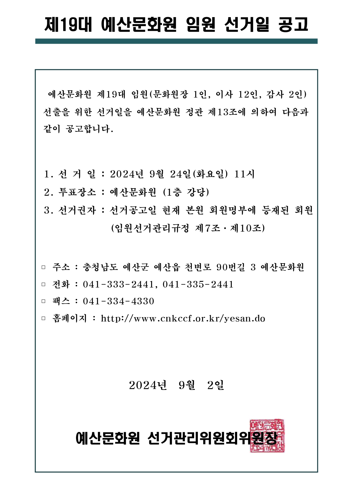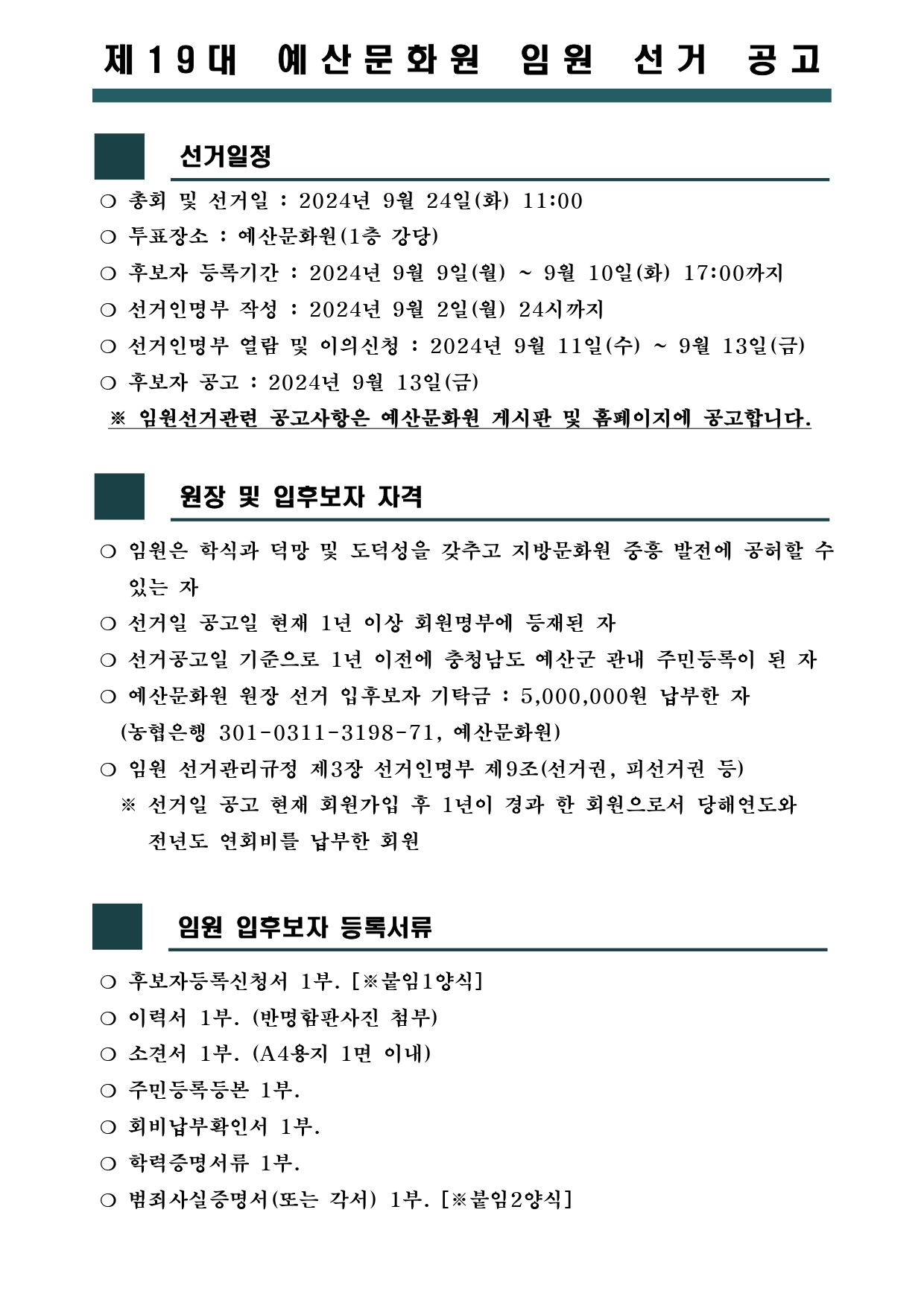 | 제목 | [선관위 공고] 제19대 예산문화원 임원 선거일 및 선거 공고 | ||||