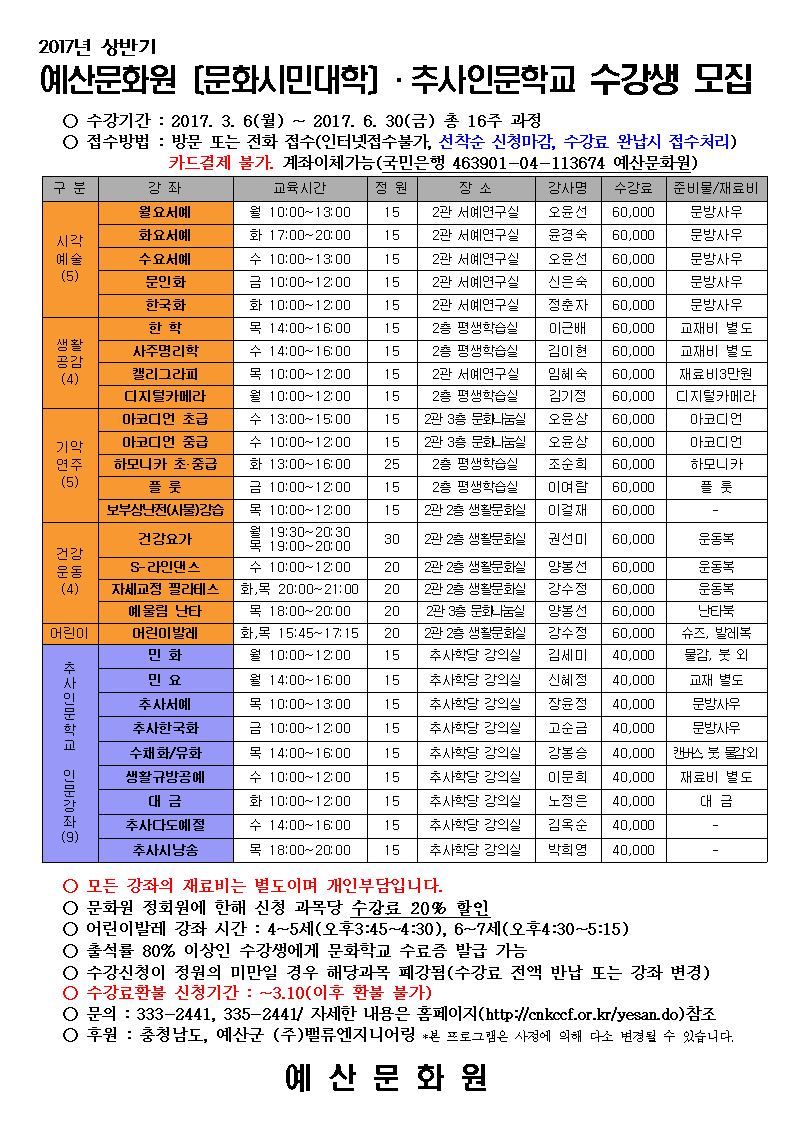 2017년 [문화시민대학], 추사인문학교 수강생 모집 안내 수강기간 : 2017.3.6(월) ~ 2017.6.30(금) 총 16주 과정 접수방법 : 방문 또는 전화 접수(인터넷접수 불가, 선착순 신청마감, 수강료 완납시 접수처리) 카드결제 불가, 계좌이체 가능(국민은행 463901-04-113674 예금주: 예산문화원)