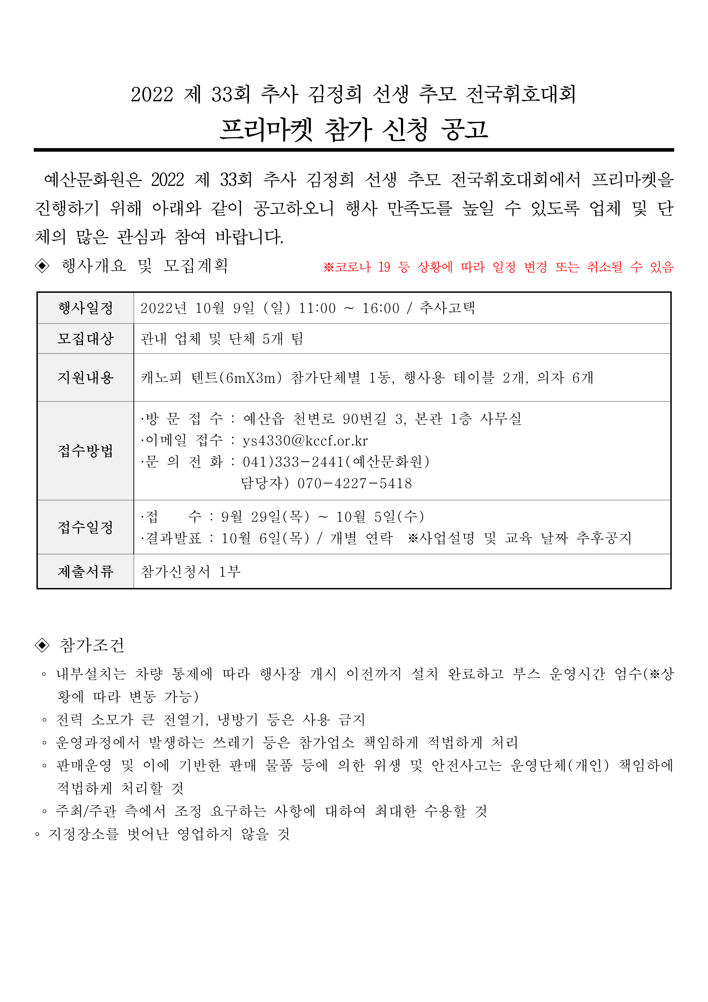 | 제목 | [프리마켓 모집 공고] 제33회 추사김정희선생추모 전국휘호대회 프리마켓 참가 신청공고 | ||||