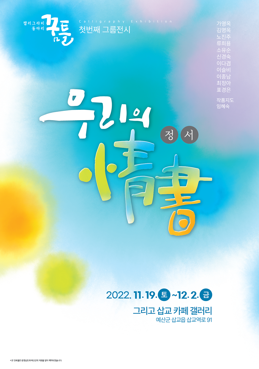 캘리그라피 동아리 "꿈틀"은 캘리그라피를 취미로 하는 다양한 연령대가 모여 즐겁게 배우며 활동하는 예술동아리입니다. 2017년 예산문화원 캘리그라피반에서 시작된 꿈틀은 동아리 지원사업 참여, 생활문화 축제 전시 참여, 수채캘리와 도자기캘리 등을 진행하며 현재까지 재미있게 활동하고 있습니다. 꿈틀 캘리그라피의 첫번째 그룹전시! 정성껏 준비하였으니, 관심 있는 군민 여러분의 많은 관람바랍니다.