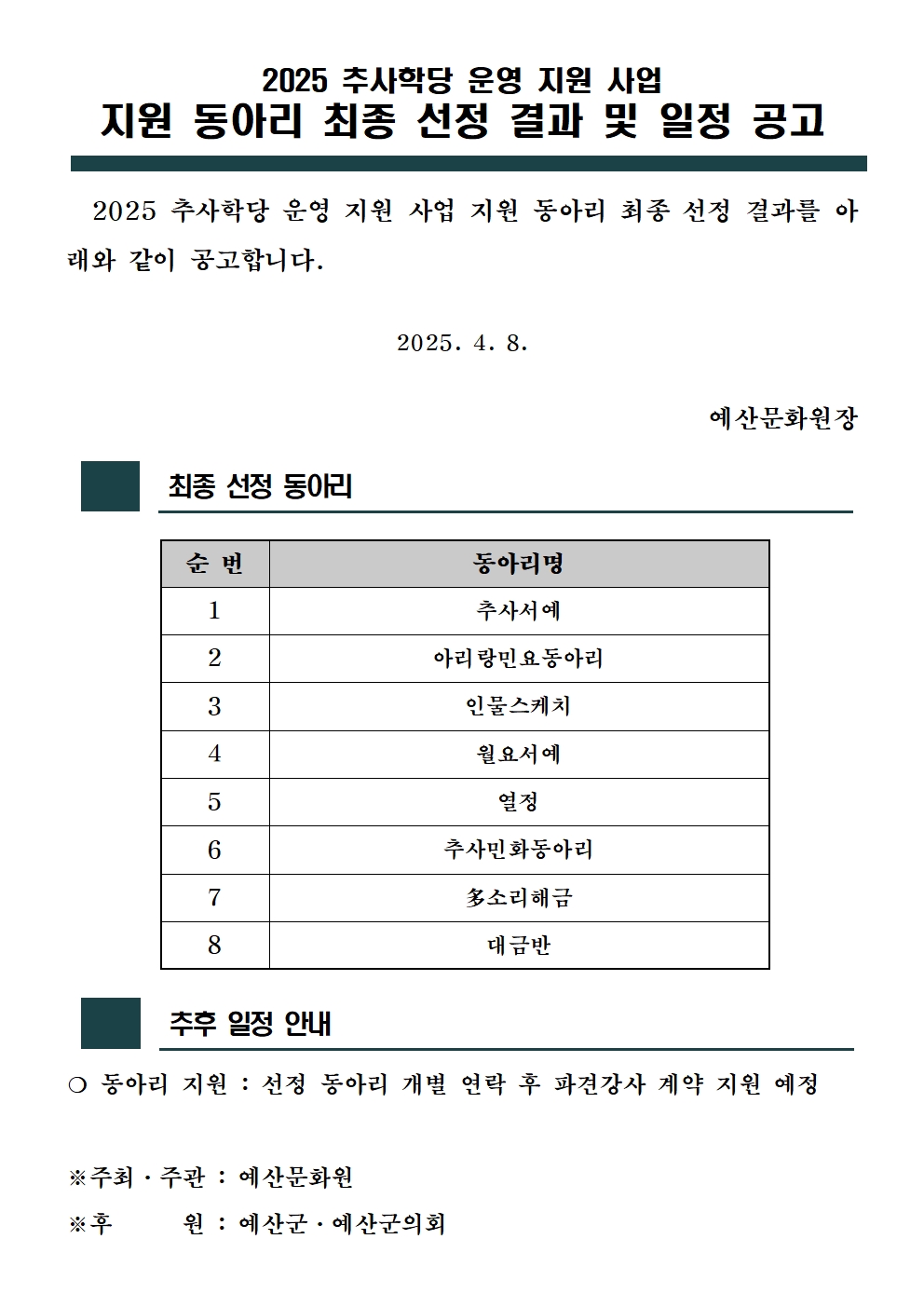 2025 추사학당 지원 동아리 최종 선정 결과 및 일정 공고