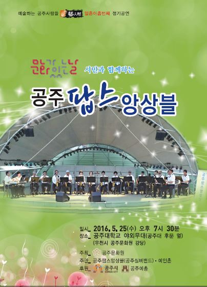 장소: 공주대학교 야외무대(공주대 후문 옆) 햇살의 온도가 점점 올라가는 5월, 여름의 문턱에서 풀들은 무성함을 더하고 있다. 본격적인 무더위에 앞서 몸과 마음의 기운을 북돋아 줄 공연 한 편을 관람하는 것은 어떨까? 5월 25일은 한 달에 한 번 찾아오는 문화가 있는 날로, 평소 할인된 가격으로 공연, 영화, 전시, 스포츠 등 문화 콘텐츠를 들길 수 있다. 우리문화원에서 5월 문화가 있는 수요일을 맞아 예술하는 공주사람들 '예인촌' 79번째 정기공연으로 공주팝스앙상블의 시원한 공연을 준비했다. |