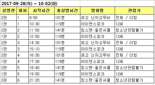 아래의 상영시간표를 확인 하시고, 군민여러분의 많은 애용 부탁드립니다.