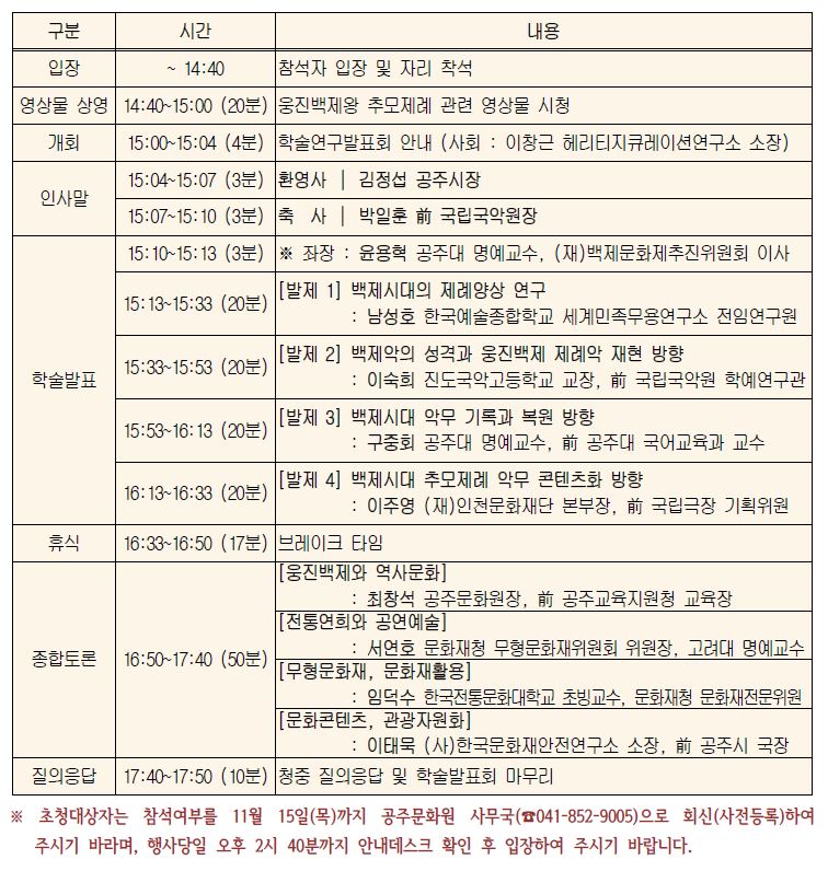 | 제목 | 웅진백제왕 추모제례 악무 콘텐츠화 학술연구 발표회 | ||||