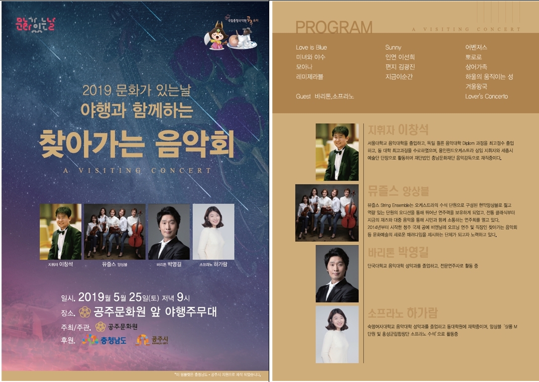 『 2019 문화가 있는 날 '야행과 함께하는 찾아가는 음악회' 』글의 상세내용을 확인하는 표로 제목, 작성자, 등록일, 조회, 첨부, 내용으로 나뉘어 설명합니다.