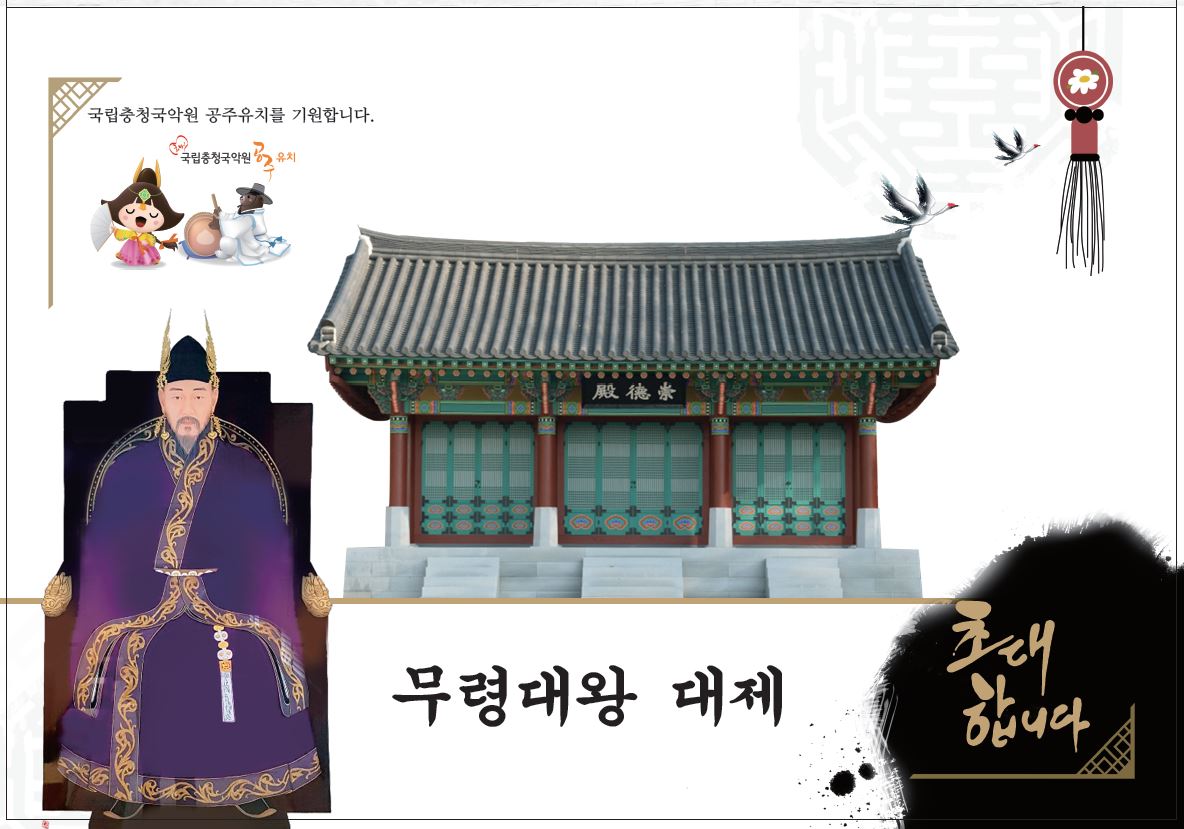 <무령대왕 대제에 초대합니다> 웅진성에서 백제중흥을 이룬 제25대 무령대왕(재위 501~523) 1496주기를 맞아 그 공덕을 높이 기리는 대제를 올리고자 합니다. 시민여러분들의 많은 관심과 참여바랍니다. 일시: 2019. 6. 9.(일) 오전 10시 장소: 숭덕전(무령왕릉)