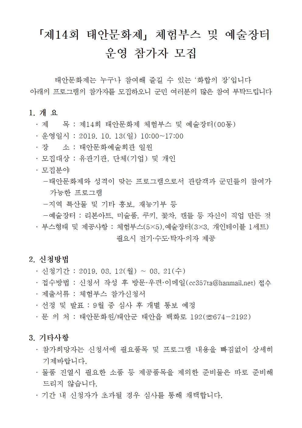 | 제목 | 제14회 태안문화제 체험부스 참가자 모집 안내 | ||||