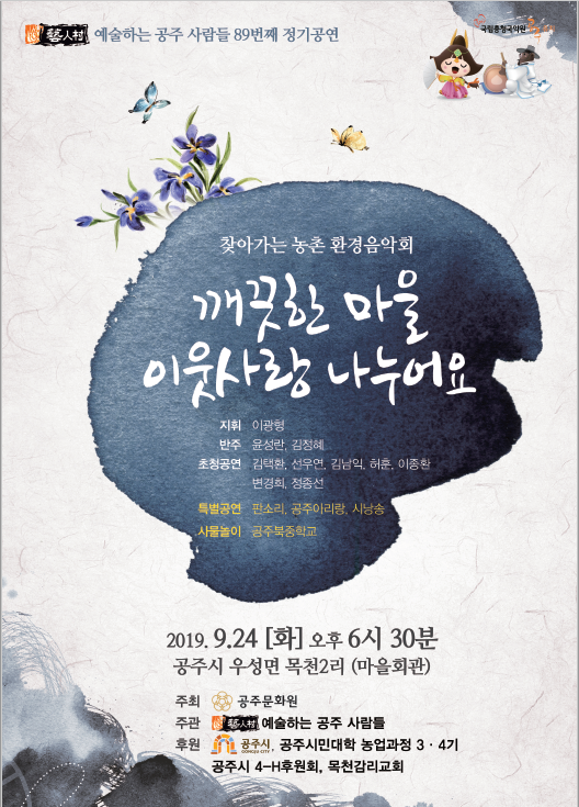 예인촌 89번째 정기공연 '깨끗한 마음 이웃사랑 나누어요'라는 주제로 9월 24일(화) 오후 6시 30분 공주 우성면 목천2리 마을회관 에서 있으니 많은 관심과 참여바랍니다.