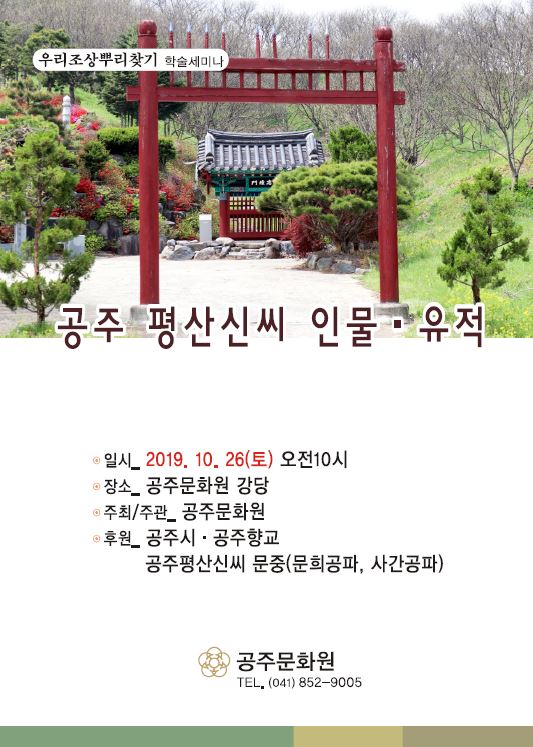 10월 26일 오전 10시 우리문화원 강당에서 공주 평산신씨 인물, 유적에 관한 학술세미나가 있습니다. 많은 참여와 관심바랍니다. *자세한 일정은 첨부파일에 있습니다. |