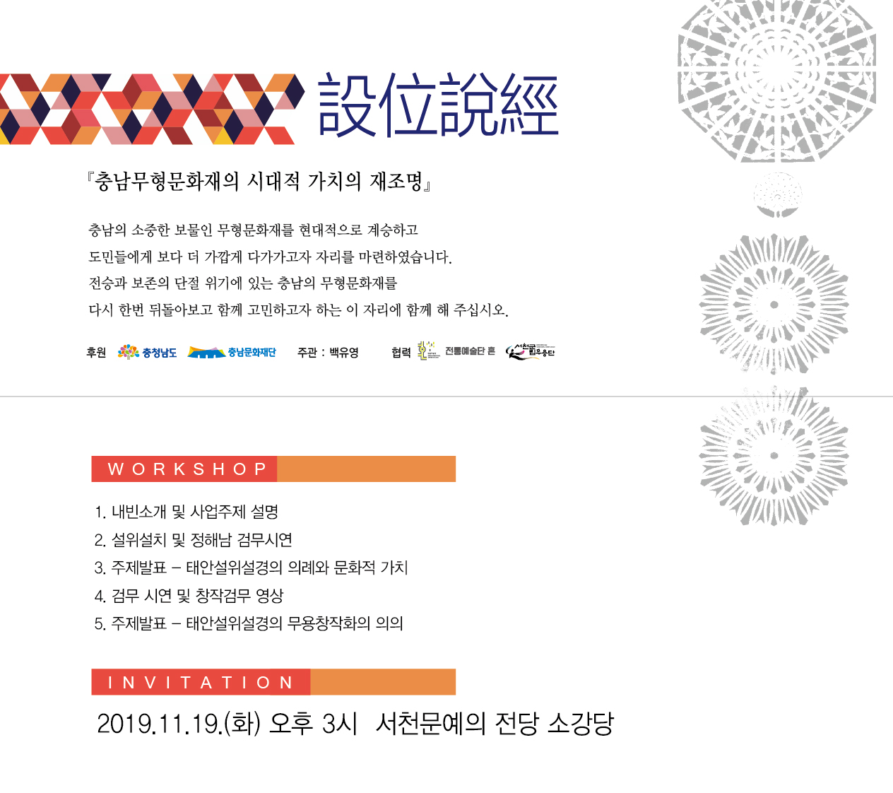 | 제목 | 충남무형문화재의 시대적 가치의 재조명(태안설위설경 공연창작 시연회) | ||||