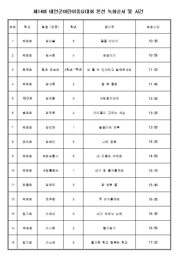 | 제목 | 제14회 태안군어린이동요대회 본선 녹화 안내입니다. | ||||
