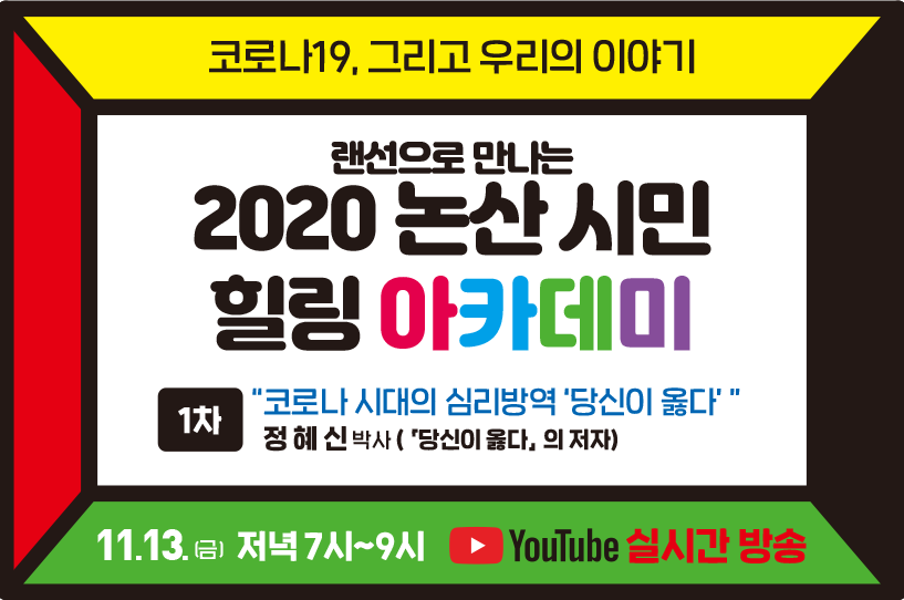 | 제목 | [온라인] 2020 논산시민 힐링 아카데미(11월13일) | ||||