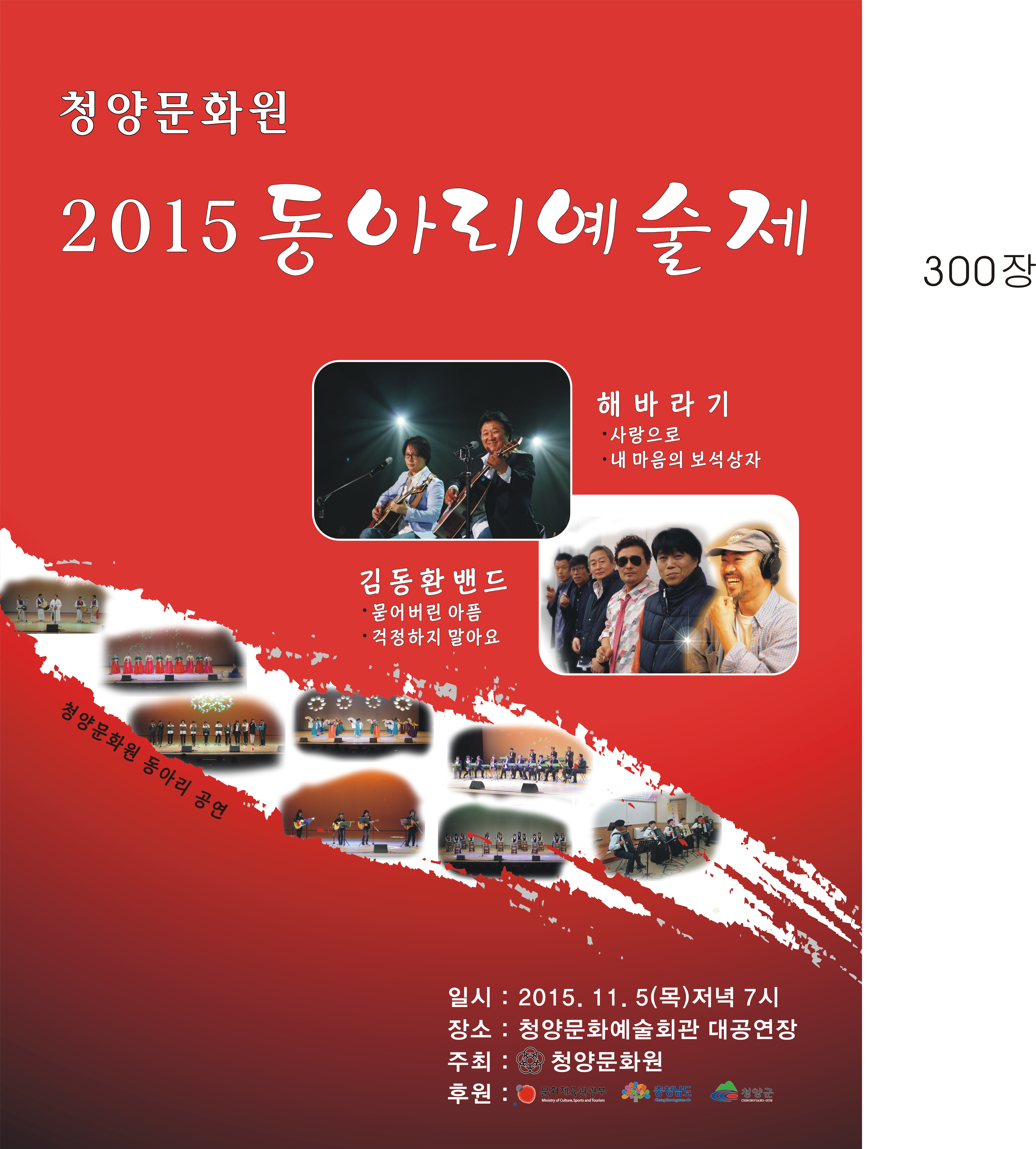 - 2015 동아리예술제 - 대지에 햇살이 머무는 시간이 짧아져 가고, 어둠이 그 자리를 살며시 대신하기 시작하는 가을의 끝자락입니다. 매년 청양문화원에서는 다양한 문화강좌를 펼치고 있습니다.그 결실을 지역민과 함께 나누고자 이번 예술제를 마련하였습니다. 이곳을 찾아주신 모든분께 지역문화예술인에 대한 애정과 관심에 깊이 감사드리며 문화의 향기를 풍길수 있도록 더욱 노력하겠습니다. 끝으로 한해를 마무리 하는 동아리예술제 공연에 아낌없는 격려와 축하의 마음을 담아 큰 박수부탁드리며 여러분의 가정에 건강과 행운이 가득하시기를 기원하며 많은 관람 부탁드립니다. ▣ 일 시 : 2015. 11. 5(목) 저녁7시 ▣ 장 소 : 청양문화예술회관 대공연장 ▣ 주 최 : 청양문화원 ▣ 후 원 : 문화체육관광부, 충청남도, 청양군 ※ 특별초청가수 : 해바라기, 김동환밴드