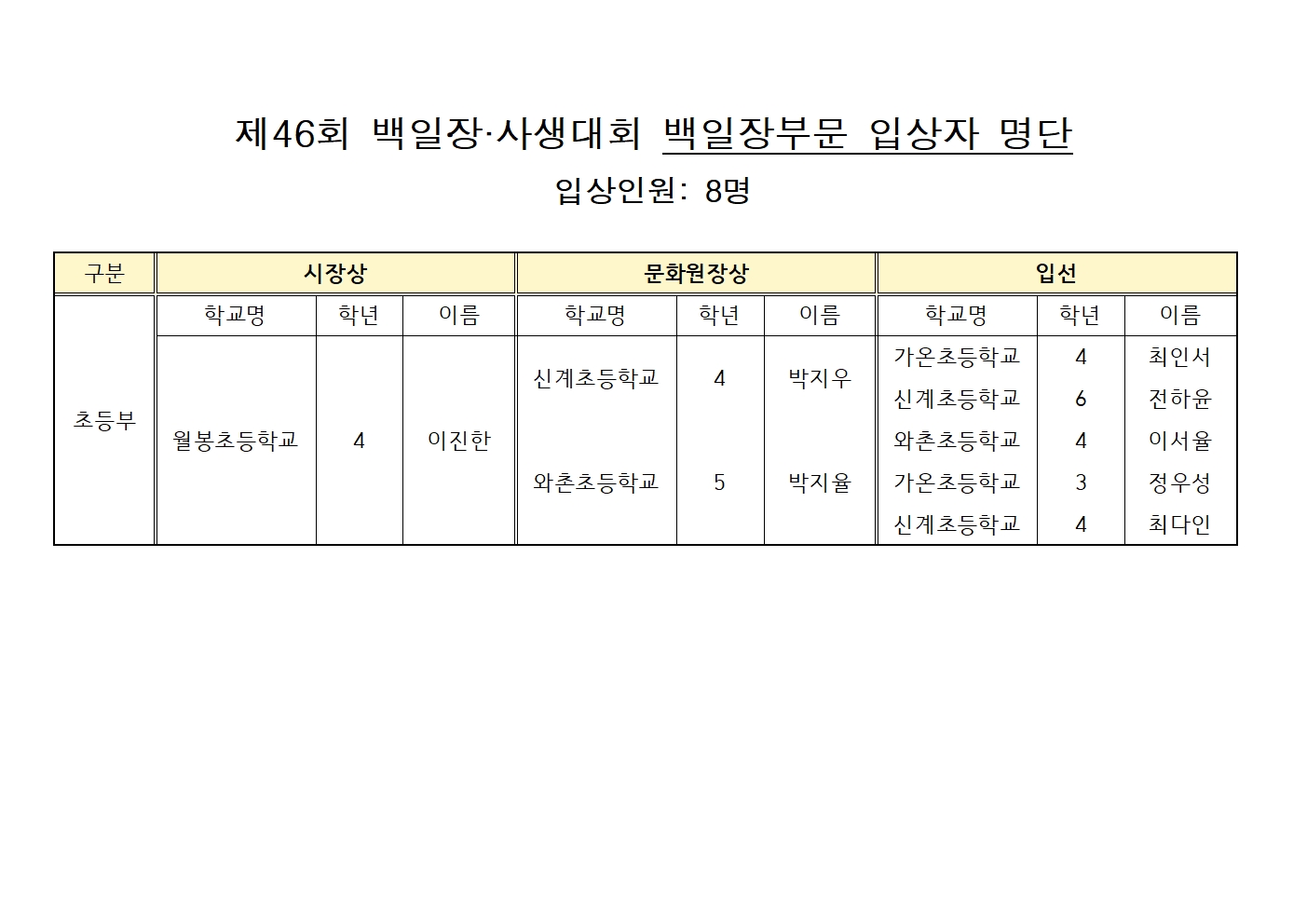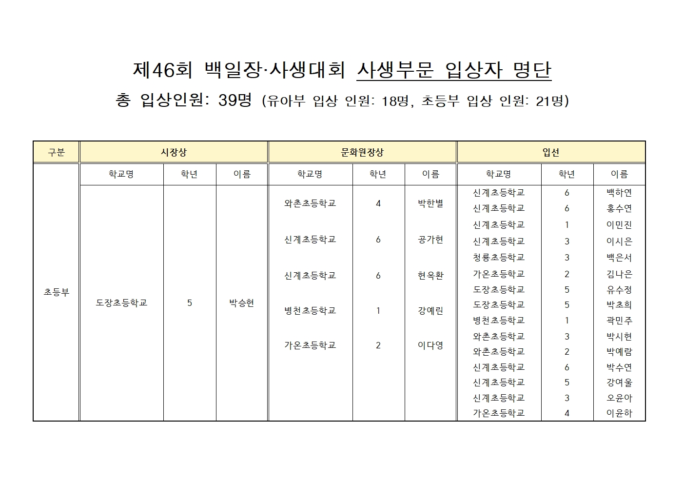 | 제목 | 제46회 백일장 사생대회 공모전 시상 명단 및 시상식 취소 알림 | ||||