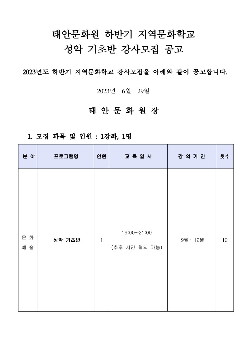 | 제목 | 2023년 하반기 문화학교 강사채용 공고 | ||||