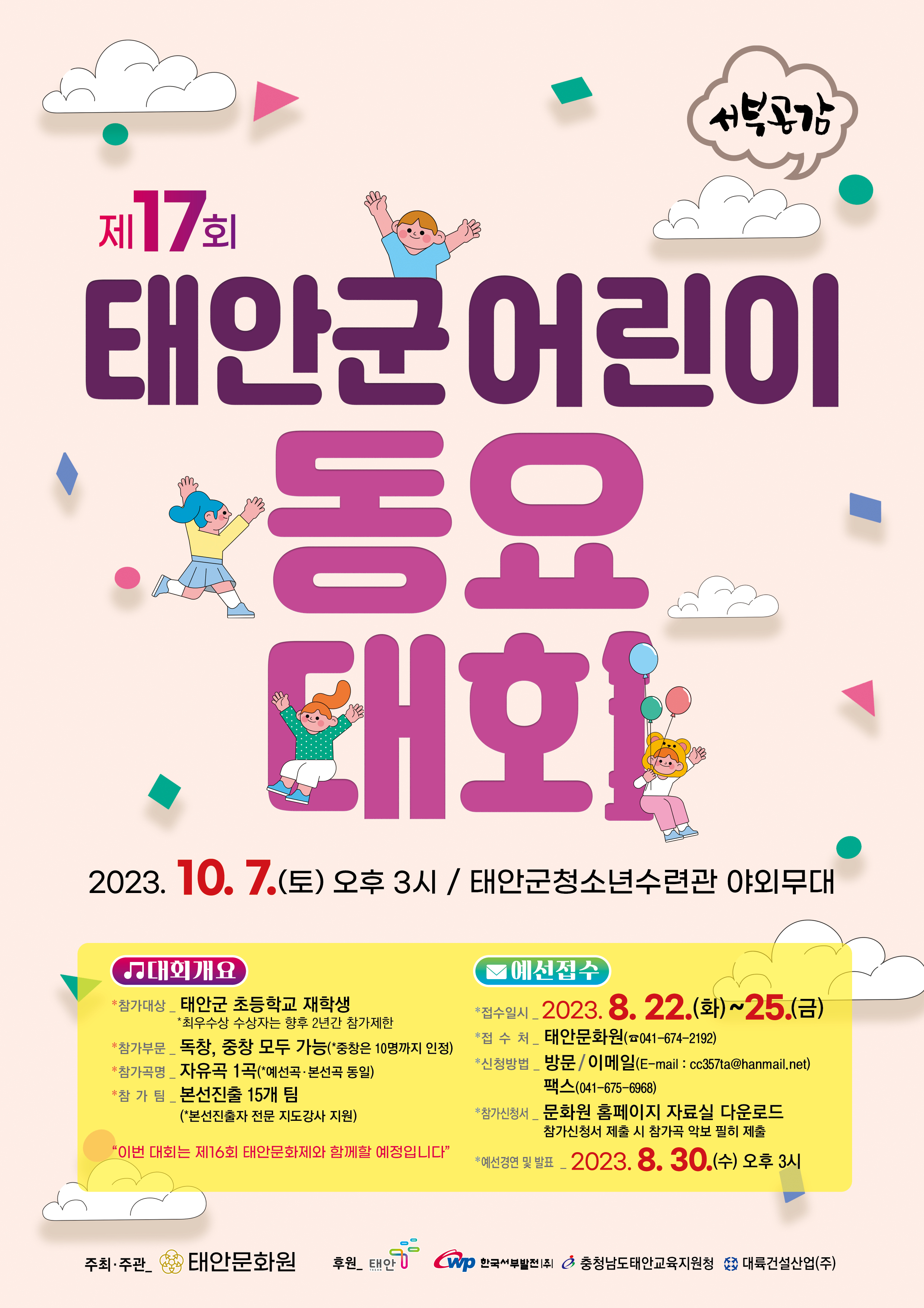 | 제목 | 제17회 태안군어린이동요대회 참가 안내 | ||||