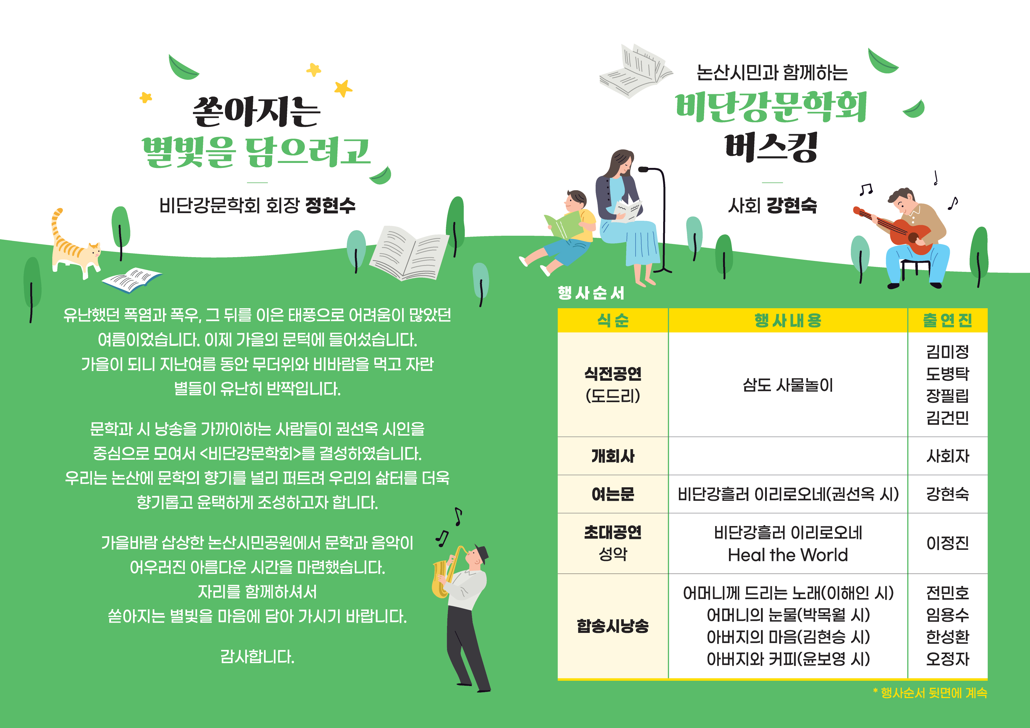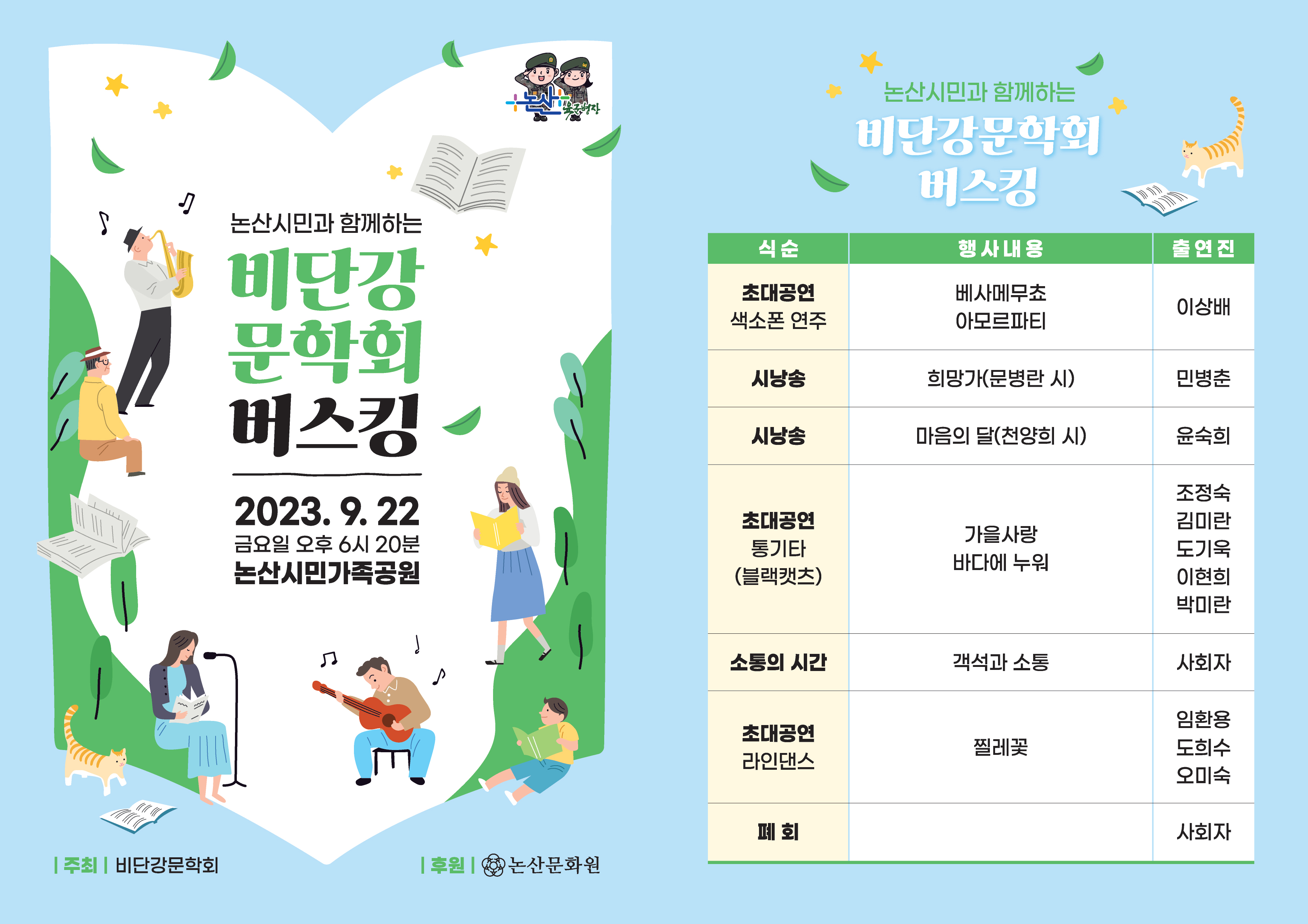 『 비단강 문학회 버스킹 』글의 상세내용을 확인하는 표로 제목, 작성자, 등록일, 조회, 첨부, 내용으로 나뉘어 설명합니다.