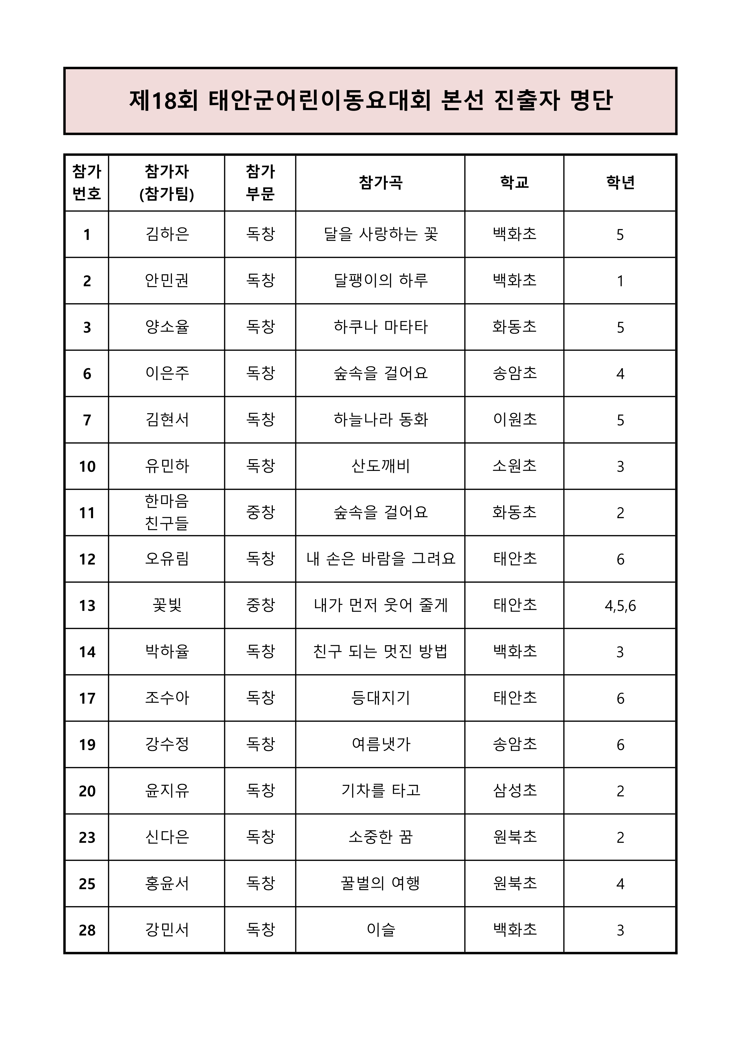 | 제목 | 제18회 태안군어린이동요대회 예선심사 결과 | ||||