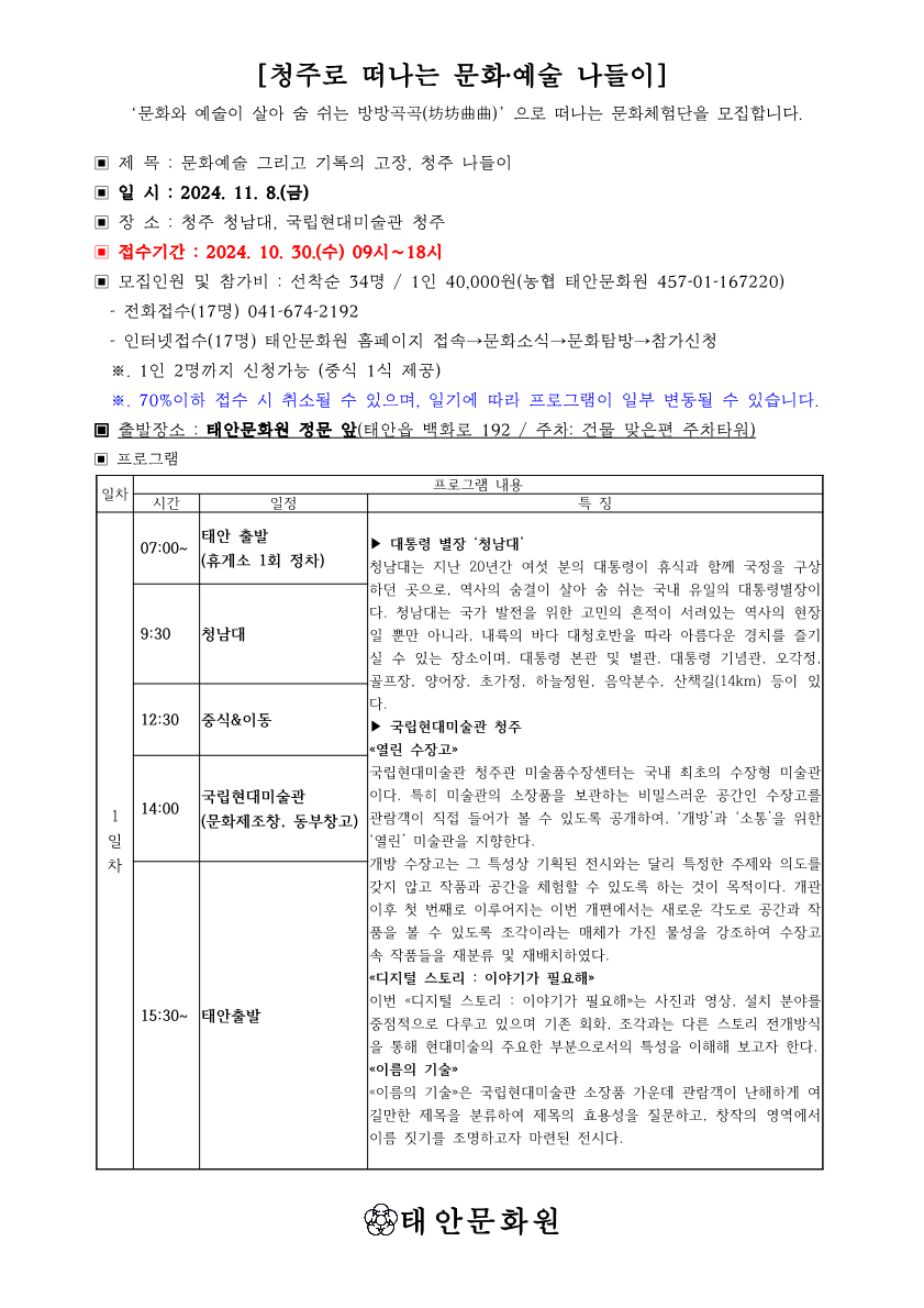 ▣ 제 목 : “청주로 떠나는 문화예술 나들이” ▣ 일 시 : 2024. 11. 8.(금) / 당일치기 ▣ 장 소 : 청남대, 국립현대미술관 청주 ▣ 접수기간 : 2024. 10. 30.(수) 09시∼18시 ▣ 모집인원 및 참가비 : 선착순 34명 / 1인 40,000원(농협 태안문화원 457-01-167220) - 전화접수(17명) 041-674-2192 - 인터넷접수(17명) 태안문화원 홈페이지 접속→문화소식→문화탐방→참가신청 ※. 1인 2명까지 신청가능 (중식 1식제공) ※. 70%이하 접수 시 취소될 수 있으며, 일기에 따라 프로그램이 일부 변동될 수 있습니다.