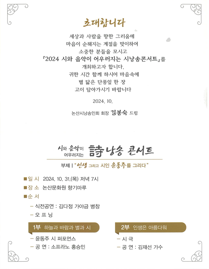시와 음악이 어우러지는 시 낭송 콘서트 글의 상세내용