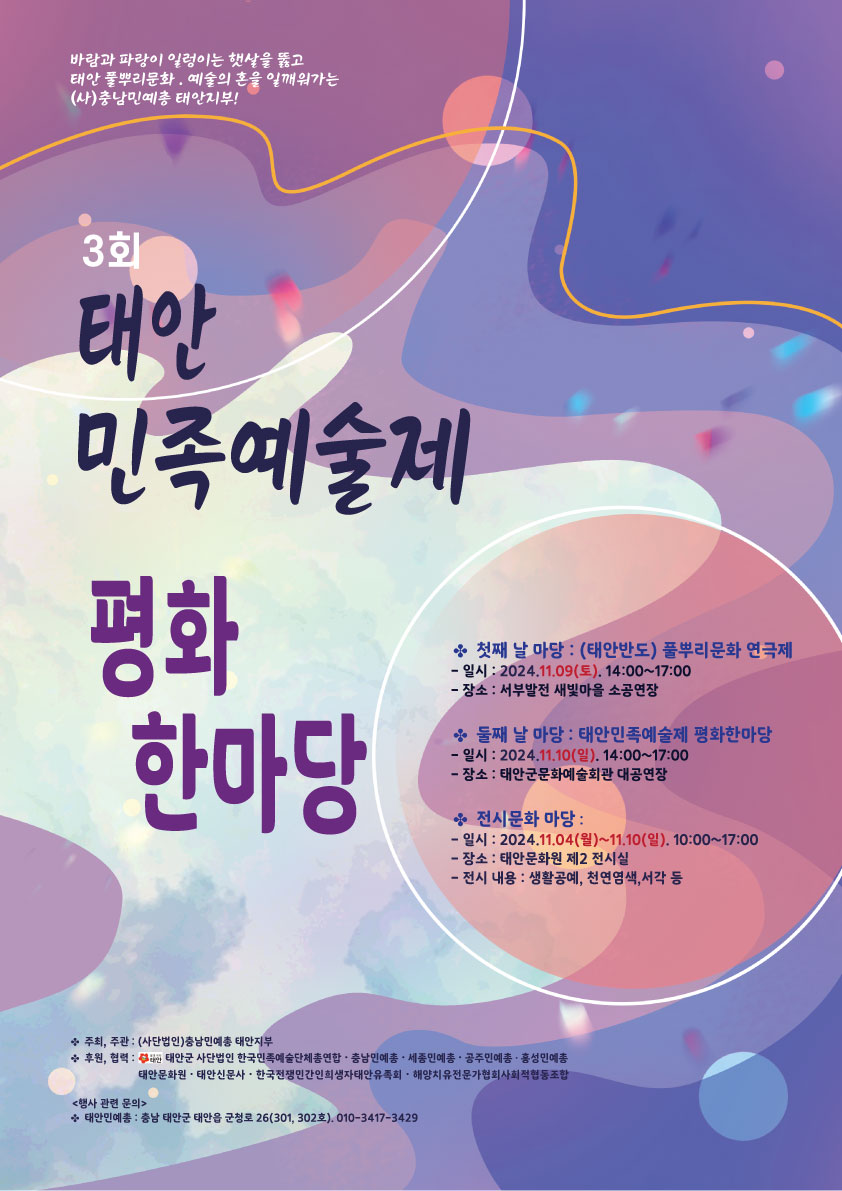 | 제목 | [행사안내] 제3회 태안 민족예술제 평화한마당 | ||||