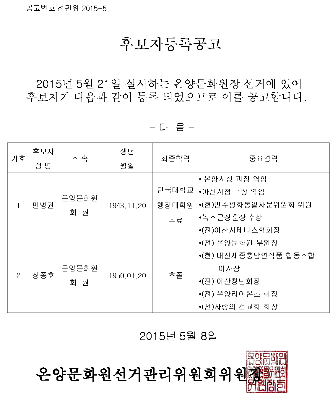 온양문화원장 보궐 선거 후보자 등록 공고 글의 상세내용