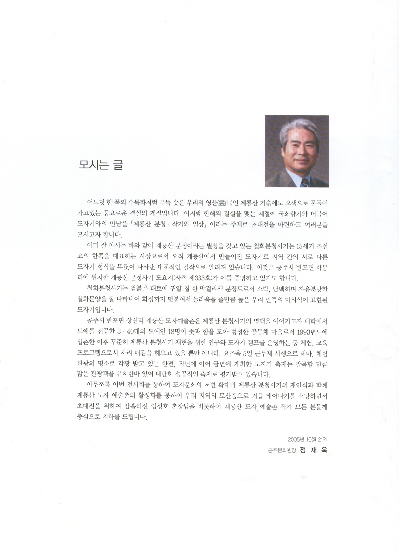 2005년 10월 공주문화원장 정 재 욱 계룡산 도자 예술촌장 임 성 호