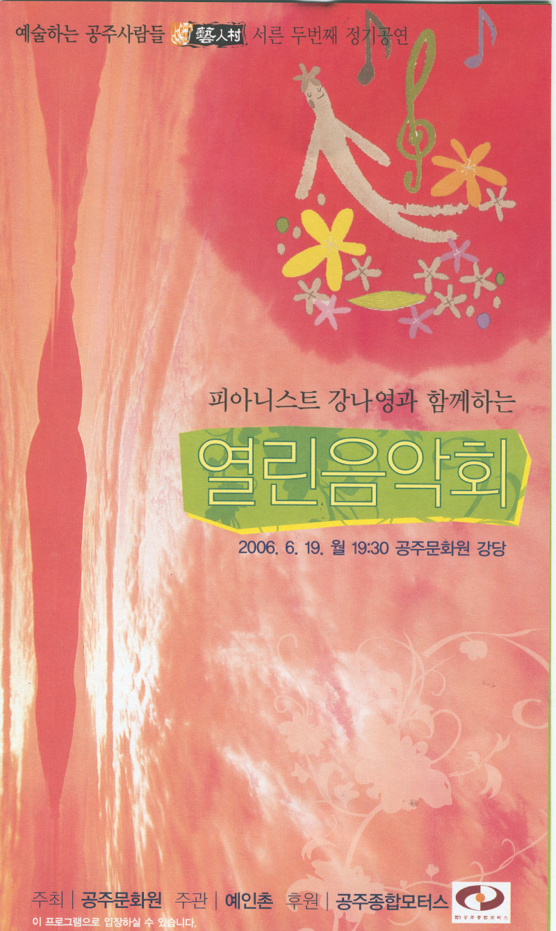 일 시 : 2006. 6. 19. 월 19:30 장 소 : 공주문화원 강당 주 최 : 공주문화원 주 관 : 예인촌 ☆프로그램☆ Piano 강나영 세레나데 달빛 Sop.유형민,P.f.강나영 환한 밤에 무지개넘어 M.sop.전진,P.f.강나영 사랑의 기쁨 아름다운 집을 갖고싶네 Sop.김진희,P.f.강나영 로렐라이 숭어 Sop.김진희,Sop.유형민,P.f.강나영 편지의 이중창-오페라'피가로의 결혼'중에서 Sop.유형민,P.f.강나영 오페라 'Porgy and Bess'중에서 M.sop.전진,P.f.강나영 오페라'Carmen'중에서 Sop.김진희,Sop.유형민, M.sop.전진,P.f.강나영 그라나다 후니쿨리 후니쿨라