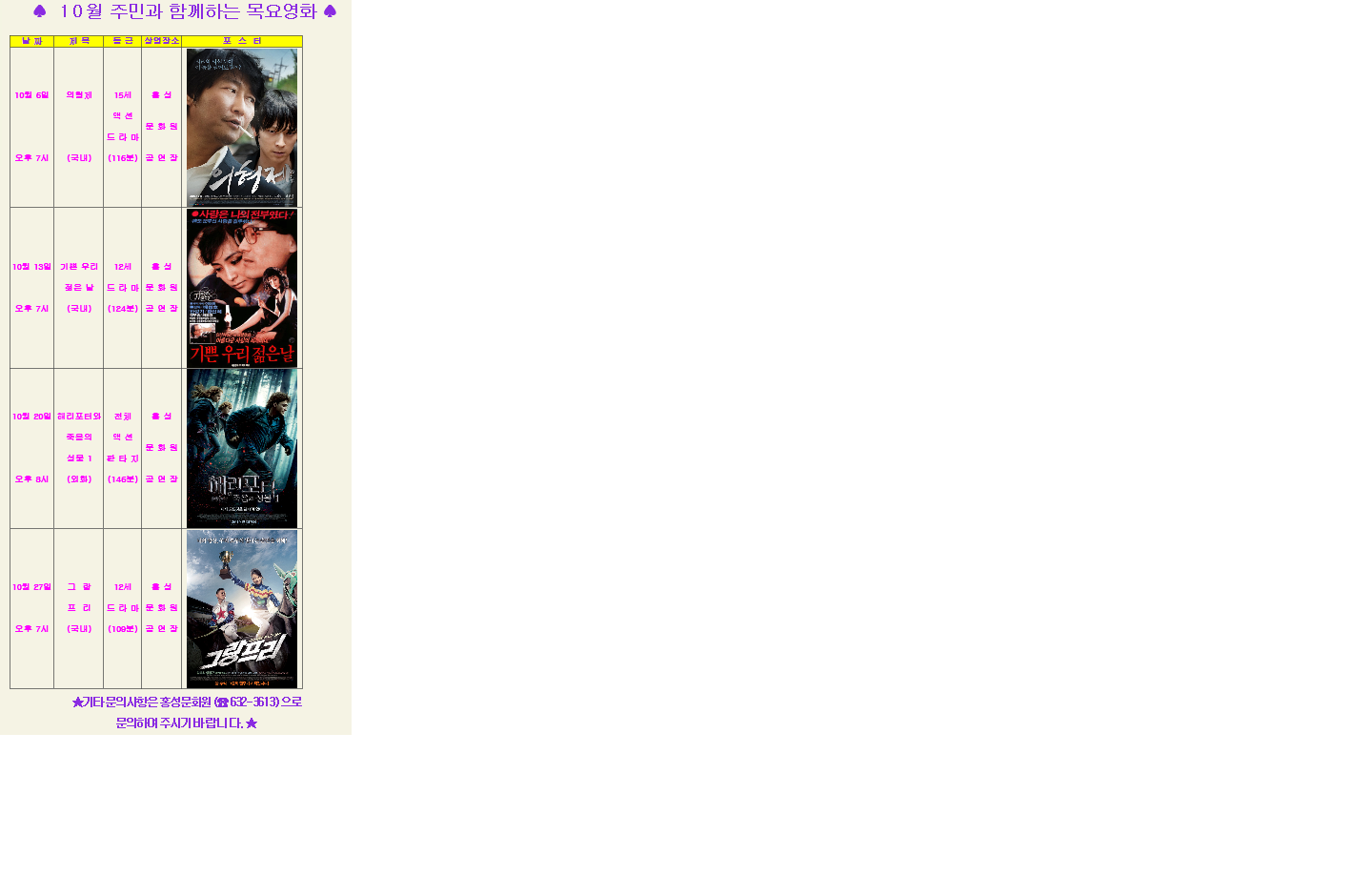 | 제목 | [영화상영] 2011 10월 주민과 함께하는 목요영화 안내 | ||||