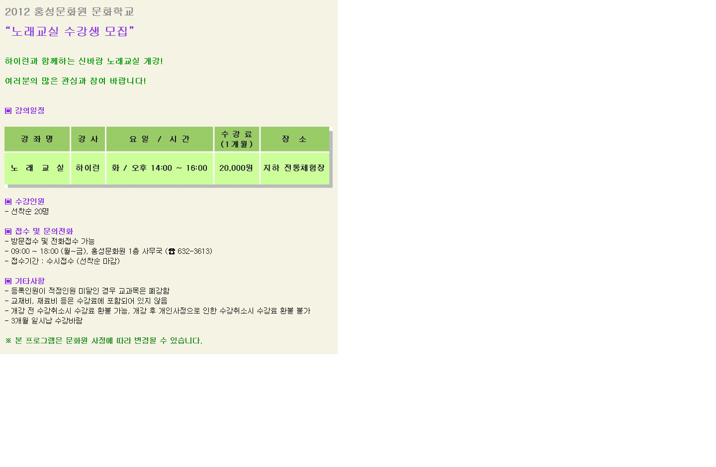 | 제목 | [문화학교] 2012 노래교실 수강생 모집 | ||||