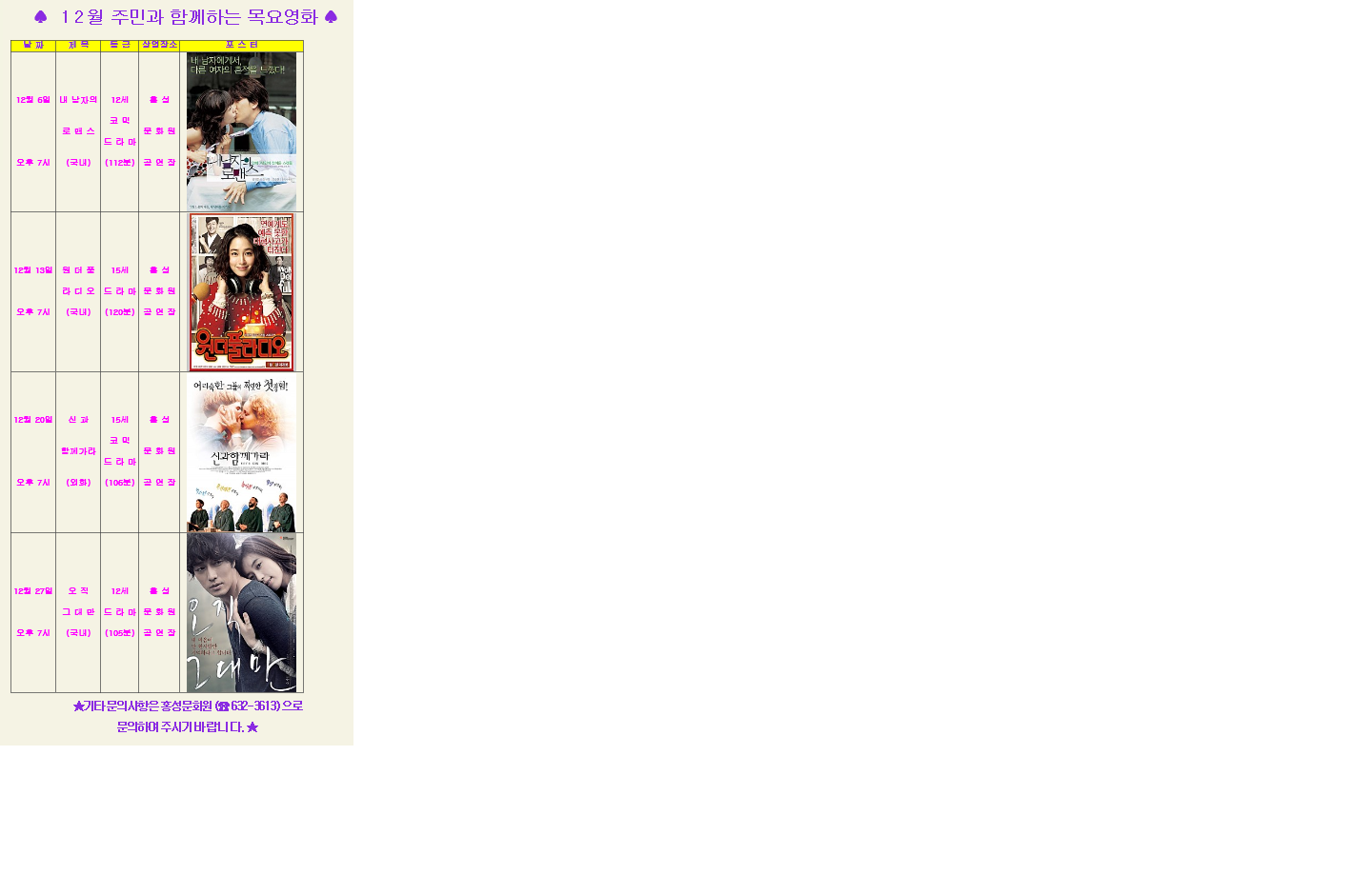 | 제목 | [영화상영] 2012 12월 주민과 함께하는 목요영화 안내 | ||||
